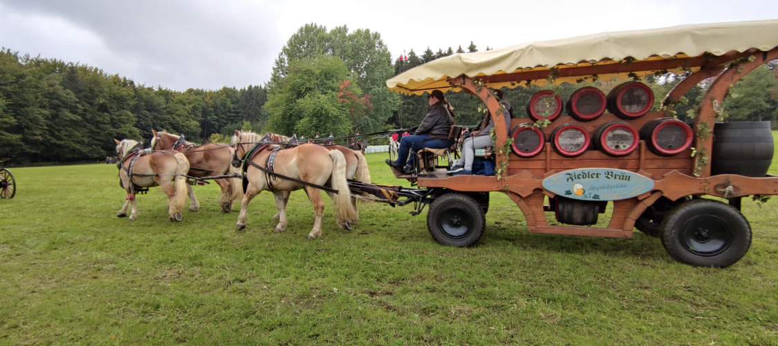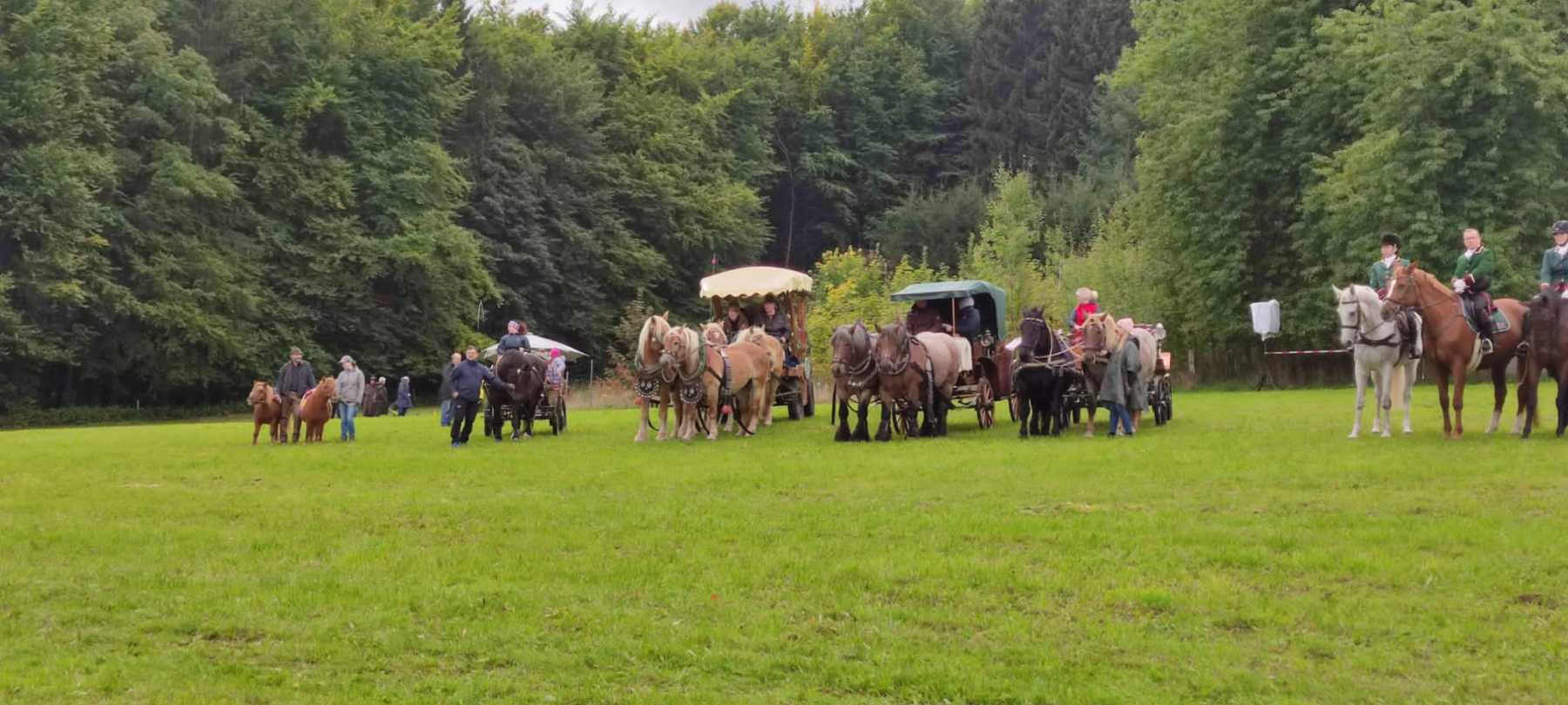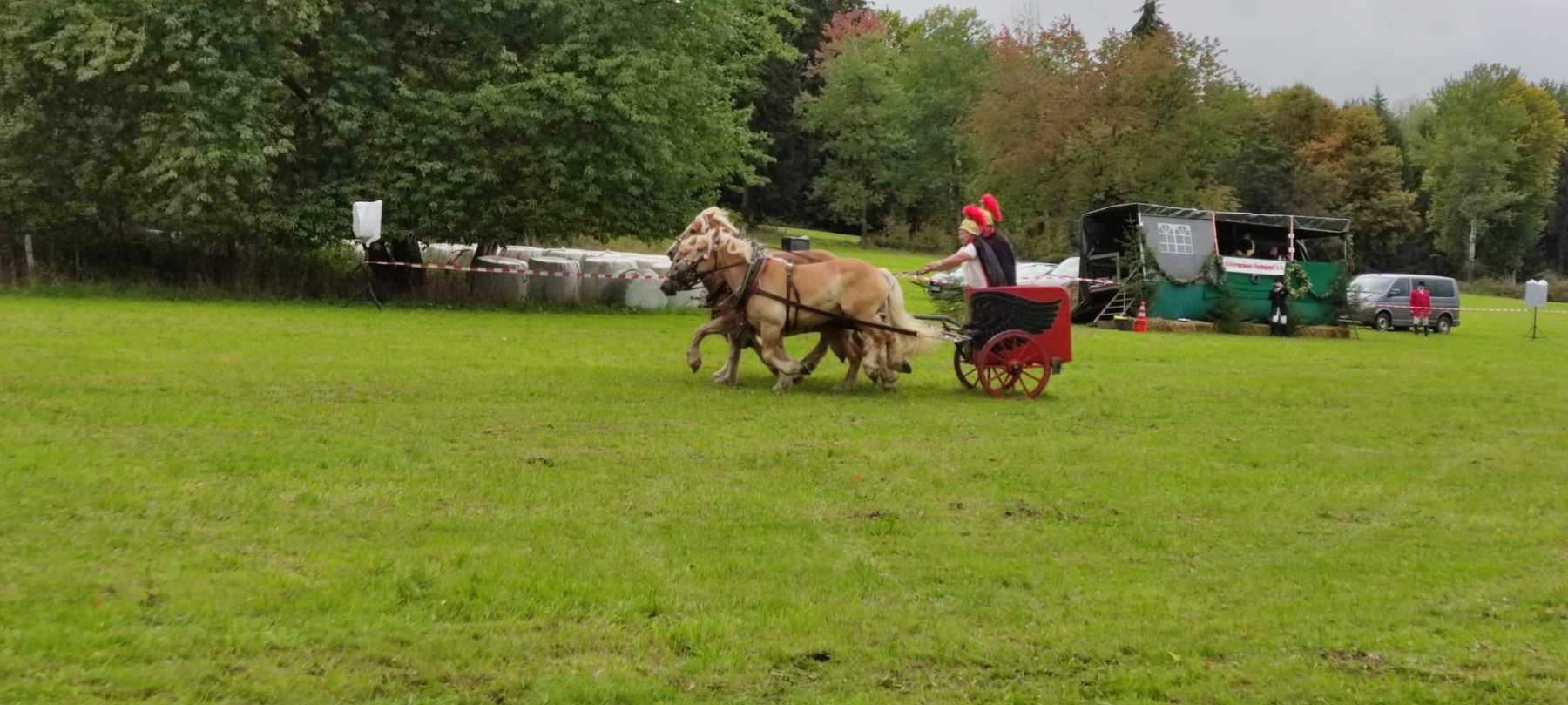 Für ordentlich Tempo auf dem Platz sorgten auch diesmal nicht nur die Reiter/innen beim Abschlussgalopp. Kaltblut-Kraftpakete in Viereranspannung vor einem römischen Streitwagen galoppierten in diesem Jahr gleich in zweifacher Ausführung über die Festwiese. Die „Quadrigen“ wurden von Frank und Florian Oelsner aus Crottendorf sowie von Clemens Nestler aus Rittersgrün gelenkt. Erstmals wurden auch viele der Gespanne, zuvor auf einer Rundfahrt durch den Ort oder zur Rossbachhütte unterwegs, ins Programm eingebunden. Beim Hindernisfahren auf dem Platz konnten sie ihr fahrerisches Geschick sowie die Schnelligkeit und Wendigkeit ihrer Pferde präsentieren.