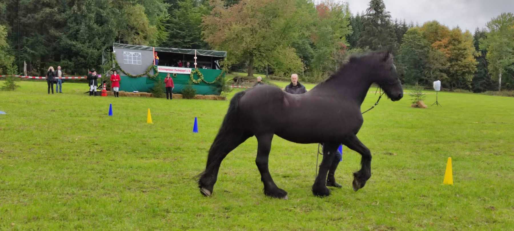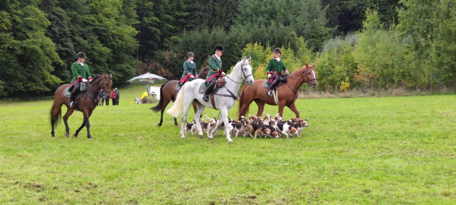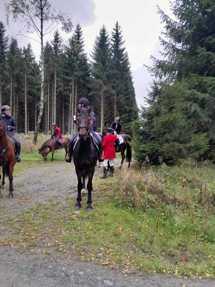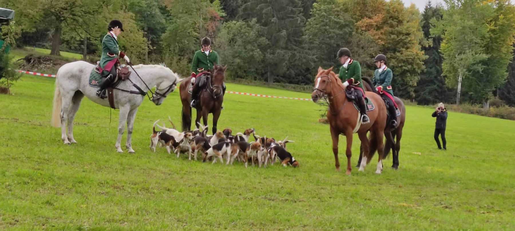 Am 2. Oktober fand dann die 30. Rittersgrüner Fuchsjagd statt. Bereits am Vormittag herrschte bei Zeltgottesdienst und Kinderprogramm reges Treiben auf dem Festgelände. Die Vorbereitungsarbeit des Vereins wurde zur Hauptveranstaltung trotz herbstlich-trübem Wetter durch den Besuch von rund 700 Zuschauern belohnt. Ein schönes Eröffnungsbild gaben die 26 Reiter und einige der insgesamt 13 teilnehmenden Gespanne ab. Als neuer Master führte in diesem Jahr Timm Meyer das Feld der Reiter an, nachdem sein Vater, Dietrich Meyer, ihm das Amt offiziell übertragen hatte. An dieser Stelle gilt unserem „Alt-Master“ nochmals ein herzlicher Dank für seine Verdienste in der Vereinsarbeit. Als Füchsin ritt Helena Lahodná vom Partnerverein Pegas aus Depoltovice. Sie vertrat die Vorjahressiegerin Peggy Lang, deren Pferd sich leider kurz vor der Veranstaltung verletzt hatte.