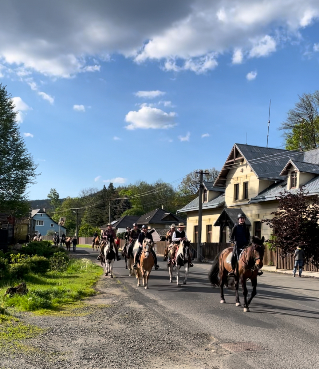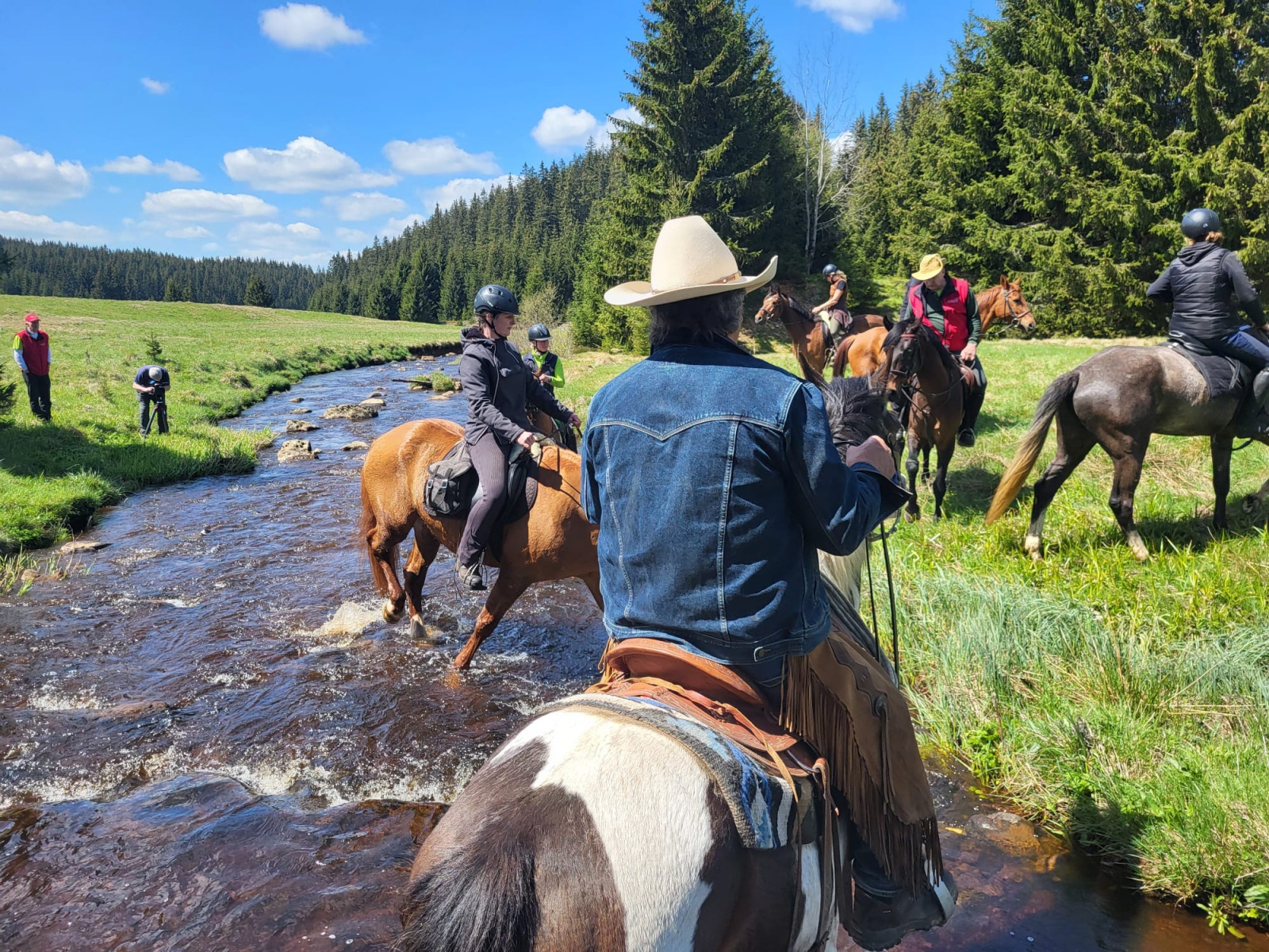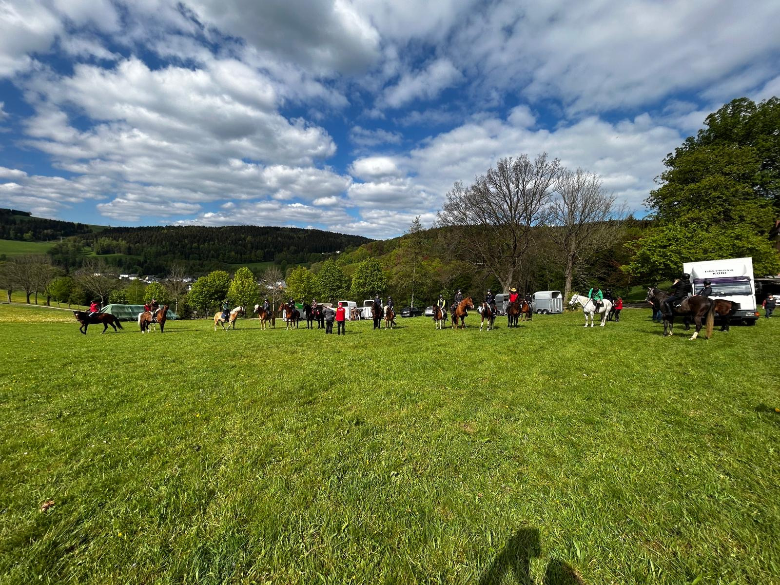 Die Sonne strahlt am 9. Mai 2024 über dem Rockstrohgut in Rittersgrün und die Wiese füllt sich langsam mit Pferdeanhängern. Es ist Christi Himmelfahrt und damit der Tag, an dem sich inzwischen traditionell eine Gruppe von Reitern auf den Weg nach Tschechien macht. Heute werden es 25 Reiter sein - die meisten aus der näheren Umgebung, einige aber auch aus der Nähe von Chemnitz und Leipzig sowie aus dem Vogtland. Eine Strecke von gut 30 km durch die erzgebirgische Landschaft liegt vor ihnen - Ziel ist der Reiterhof Pegas in Depoltovice.