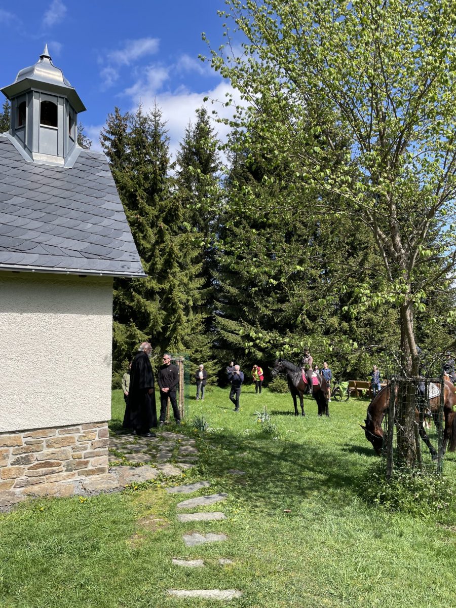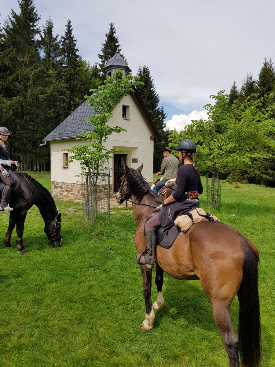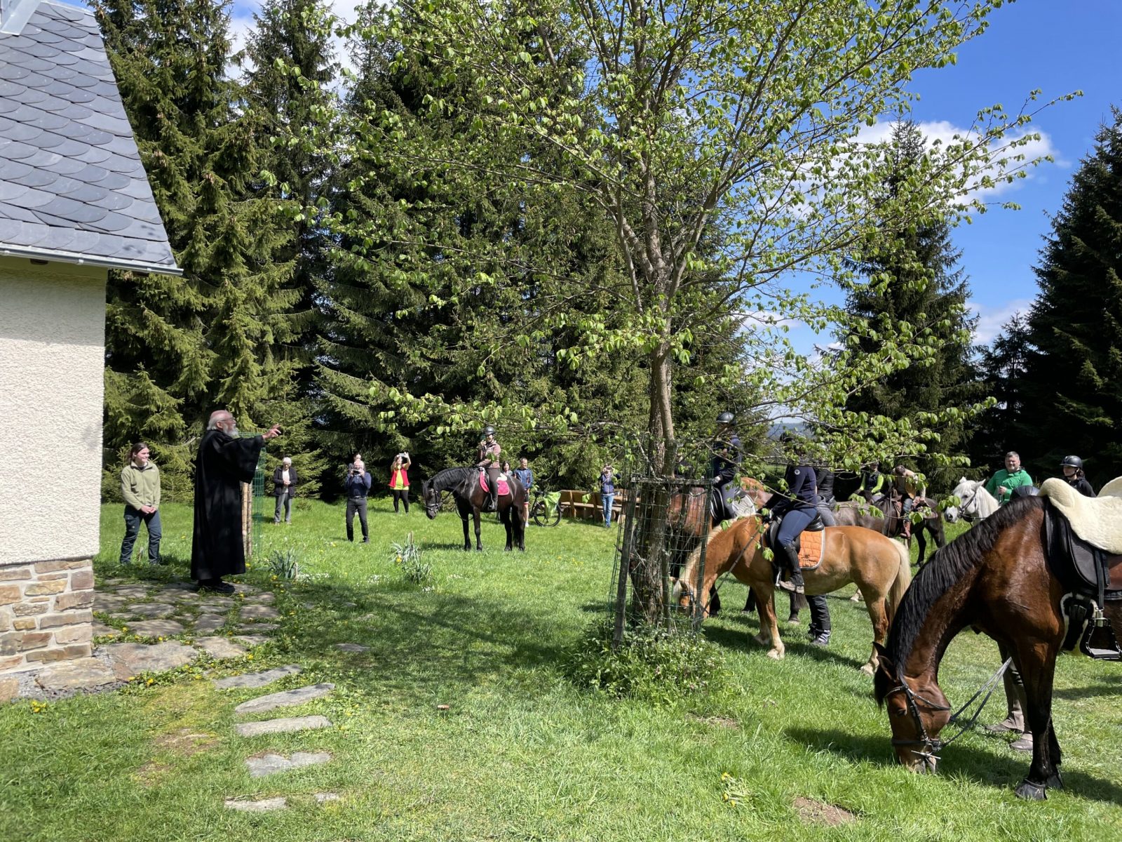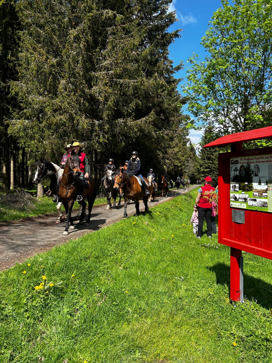 Anlässlich das 15jährigen Bestandsjubiläums durften Reiter, Begleiter und Zuschauer an der St. Nepomuk-Kapelle auf Halbmeil - der ersten Rast auf tschechischer Seite - eine Andacht durch Pfarrer i.R. Beyreuther erleben und sich mit seinem Segen auf den weiteren Weg machen. Bei bestem Frühsommerwetter konnten die Reiter auf ihrer weiteren Route nicht nur die Schönheit der Natur, sondern auch ausgedehnte Gespräche und gutes böhmisches Essen genießen. Am frühen Abend kamen Pferde und Reiter erschöpft aber gesund in Depoltovice an. Im urigen Bierkeller fand das Jubiläum dann seinen geselligen Ausklang bevor es am nächsten Morgen zu Pferd oder mit dem Anhänger zurück in die Heimat ging.