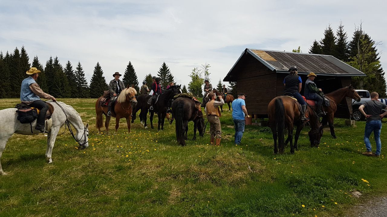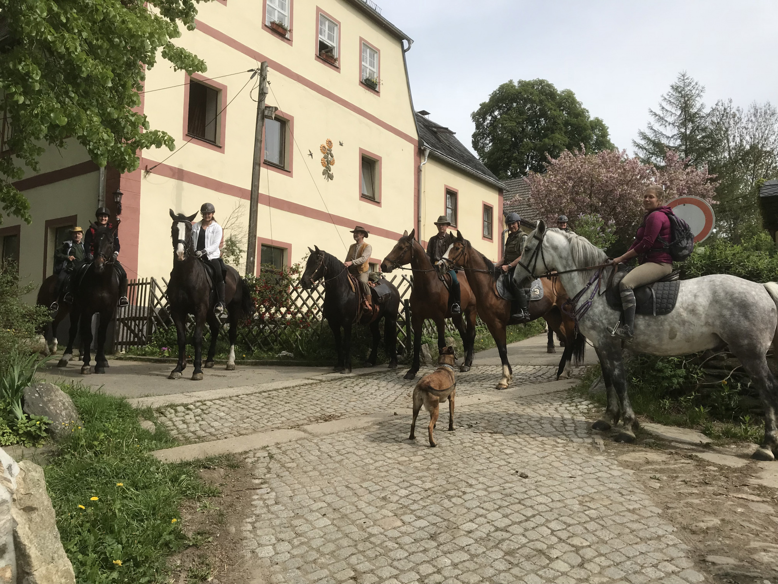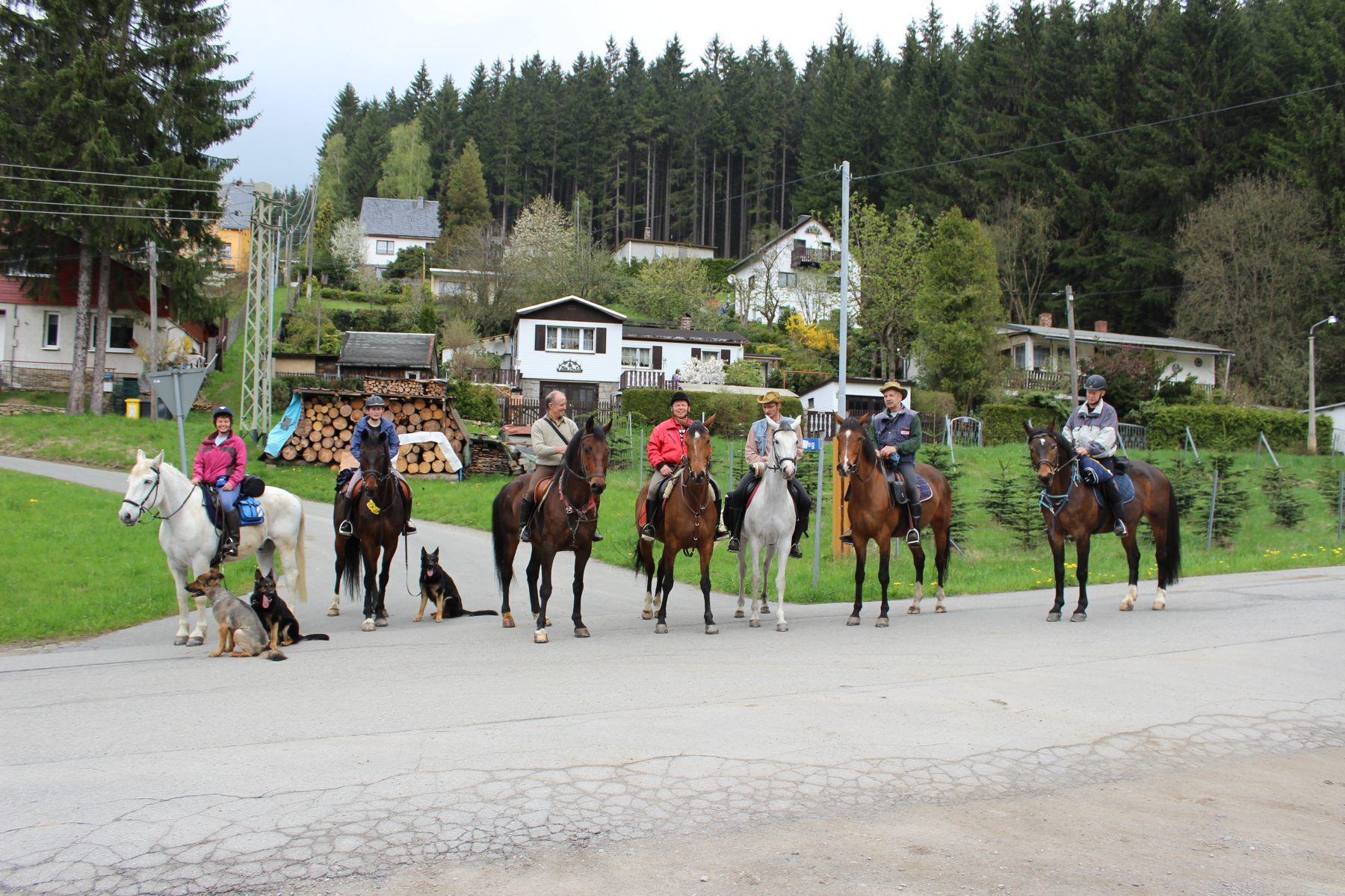 Jedes Jahr zum Männertag satteln Reiterinnen und Reiter vom Rittersgrüner Fuchsjagd – Förderverein ihre Pferde und reiten über den Erzgebirgskamm zu ihren Pferdefreunden in den Karlsbader Kreis. In diesem Jahr waren es nur 4 Pferde, ein fünftes Pferd war leider kurzfristig erkrankt. Nach ca. 6 Stunden im Sattel und 33 km in den Pferdebeinen war das Tagesziel erreicht – der Reitstall JP Pegas in Depoltovice, kurz vor Karlsbad. Die Pferde wurden in Boxen untergebracht und die Reiter in der netten Pension. Am Abend gab es ein gemütliches Zusammentreffen mit Freunden und Bekannten bei gutem Essen und böhmischen Bier im urigen Bierkeller. Am nächsten Tag ging es dann ausgeruht zurück nach Rittersgrün. Neben den schönen Stunden steht aber noch ein wichtiges Ergebnis zu Buche: Bei diesem Ritt wurde der Reitwanderweg digitalisiert und steht nun auf unserer Homepage zum Download bereit. Obwohl der Reitweg gut ausgeschildert ist, gibt das Reiten durch die Wälder und Fluren nach GPS – Navigation eine größere Sicherheit.